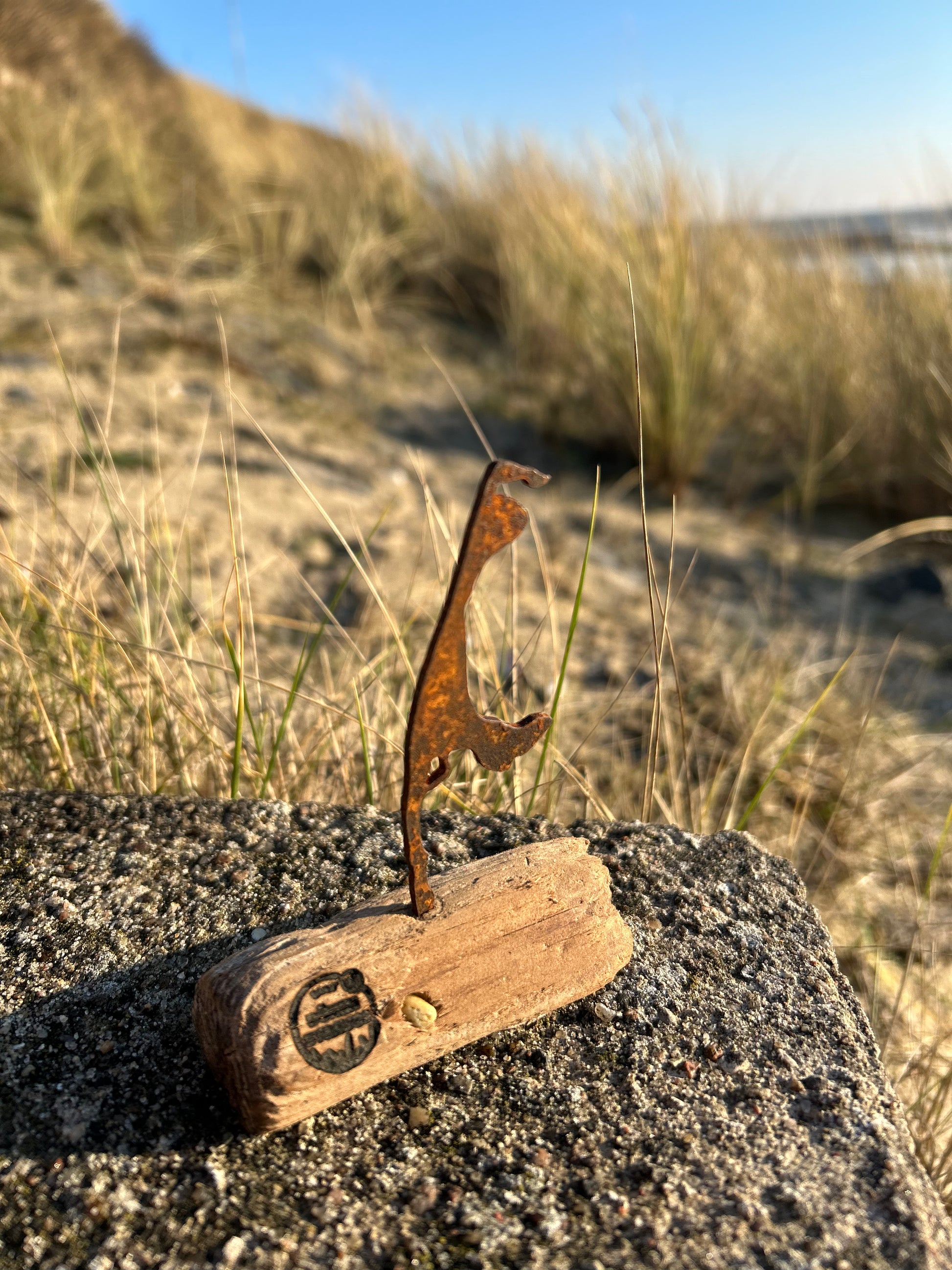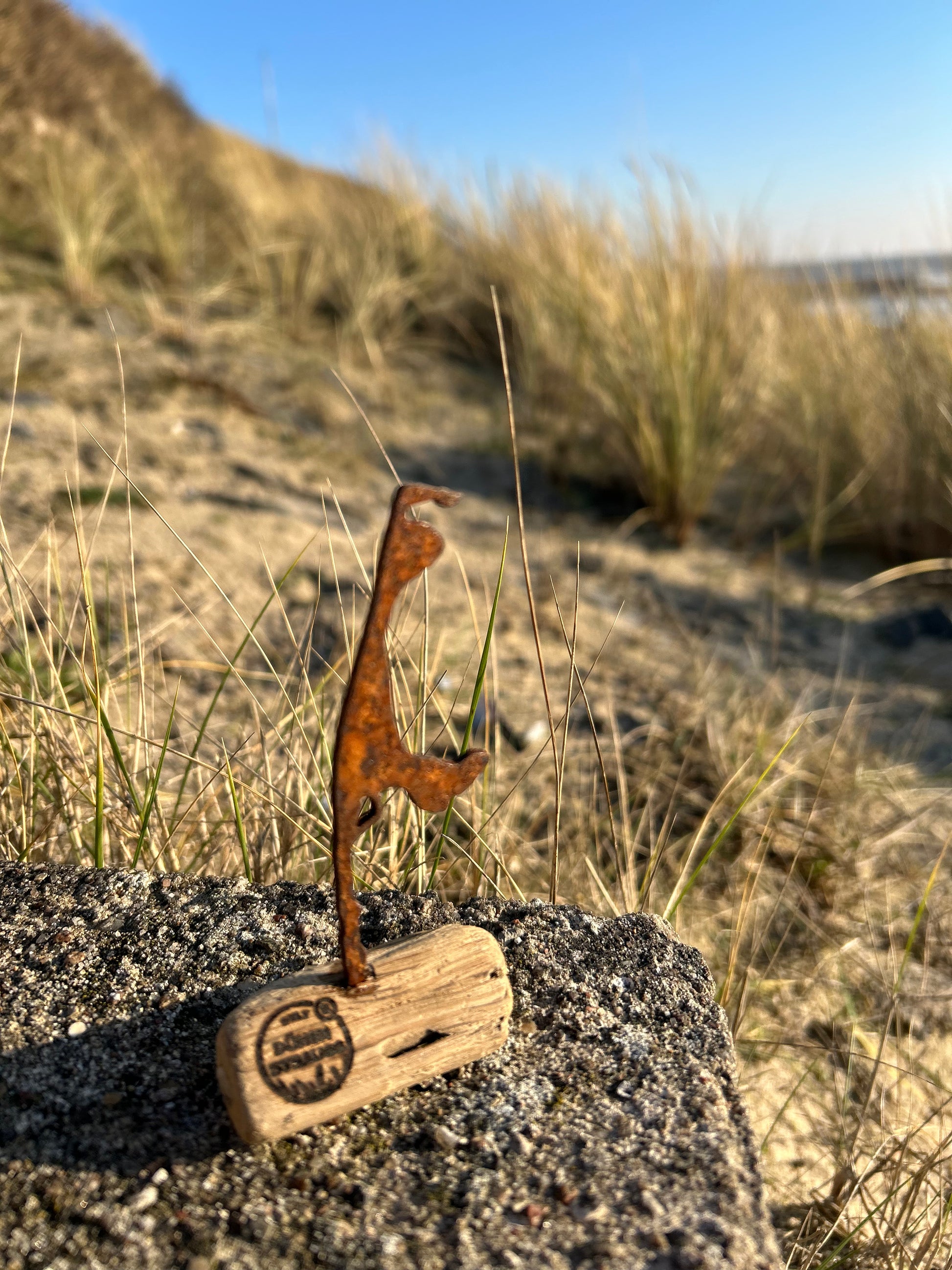Aus 2 mm massivem Vollstahl gefertigt und in der salzhaltigen Nordseeluft natürlich gerostet, trägt sie die unverwechselbare Silhouette der Insel Sylt mit all ihrem Charme und ihrer Symbolkraft.